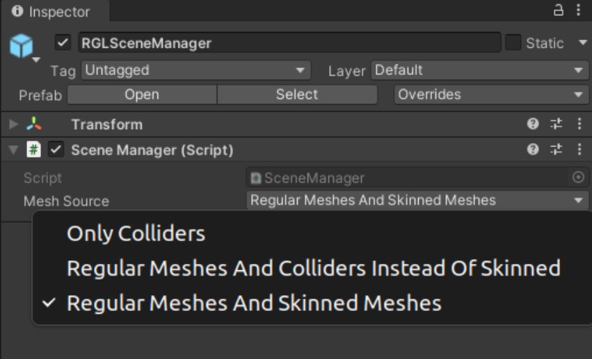 RGLUnityPluginsupports two types of meshes: static (rendered by Mesh Renderer) and animated (rendered by Skinned Mesh Renderer). Static meshes could be shared between Entities.