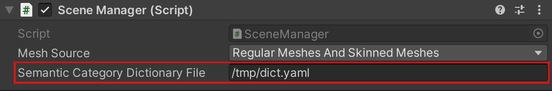 To enable saving dictionary mapping set output file path to the Semantic Category Dictionary File property in the Scene Manager component: