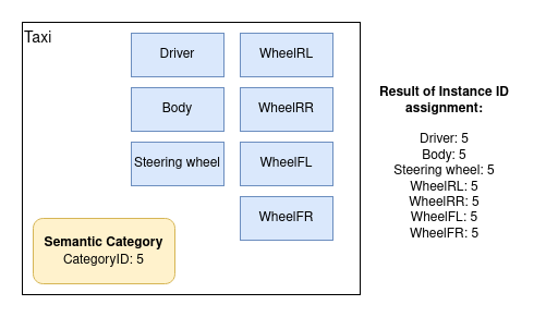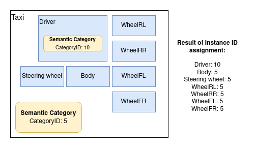 SemanticCategory component is assigned to the Taxi GameObject. All meshes in the Taxi GameObject will have the same instance ID as Taxi:*