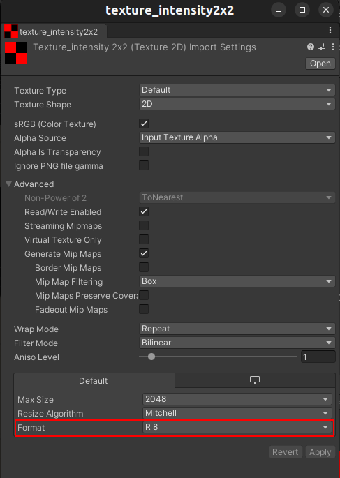 The texture has to be in R8 format. That means 8bit in the red channel (255 possible values).
