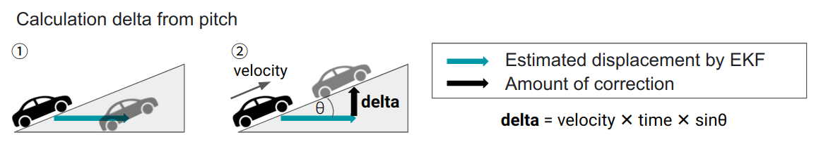 - Calculation of vertical correction amount from pitch mitigates localization instability on slopes. For example, when going uphill, it behaves as if it is buried in the ground (see the left side of the "Calculate delta from pitch" figure) because EKF only considers 3DoF(x,y,yaw). Therefore, EKF corrects the z-coordinate according to the formula (see the right side of the "Calculate delta from pitch" figure).
