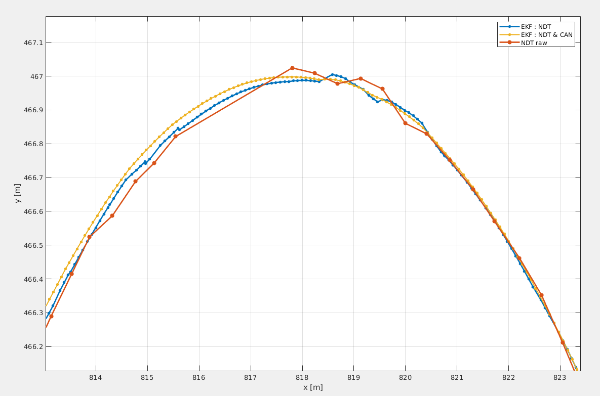 The Extend Kalman Filter Localizer estimates robust and less noisy robot pose and twist by integrating the 2D vehicle dynamics model with input ego-pose and ego-twist messages. The algorithm is designed especially for fast-moving robots such as autonomous driving systems.