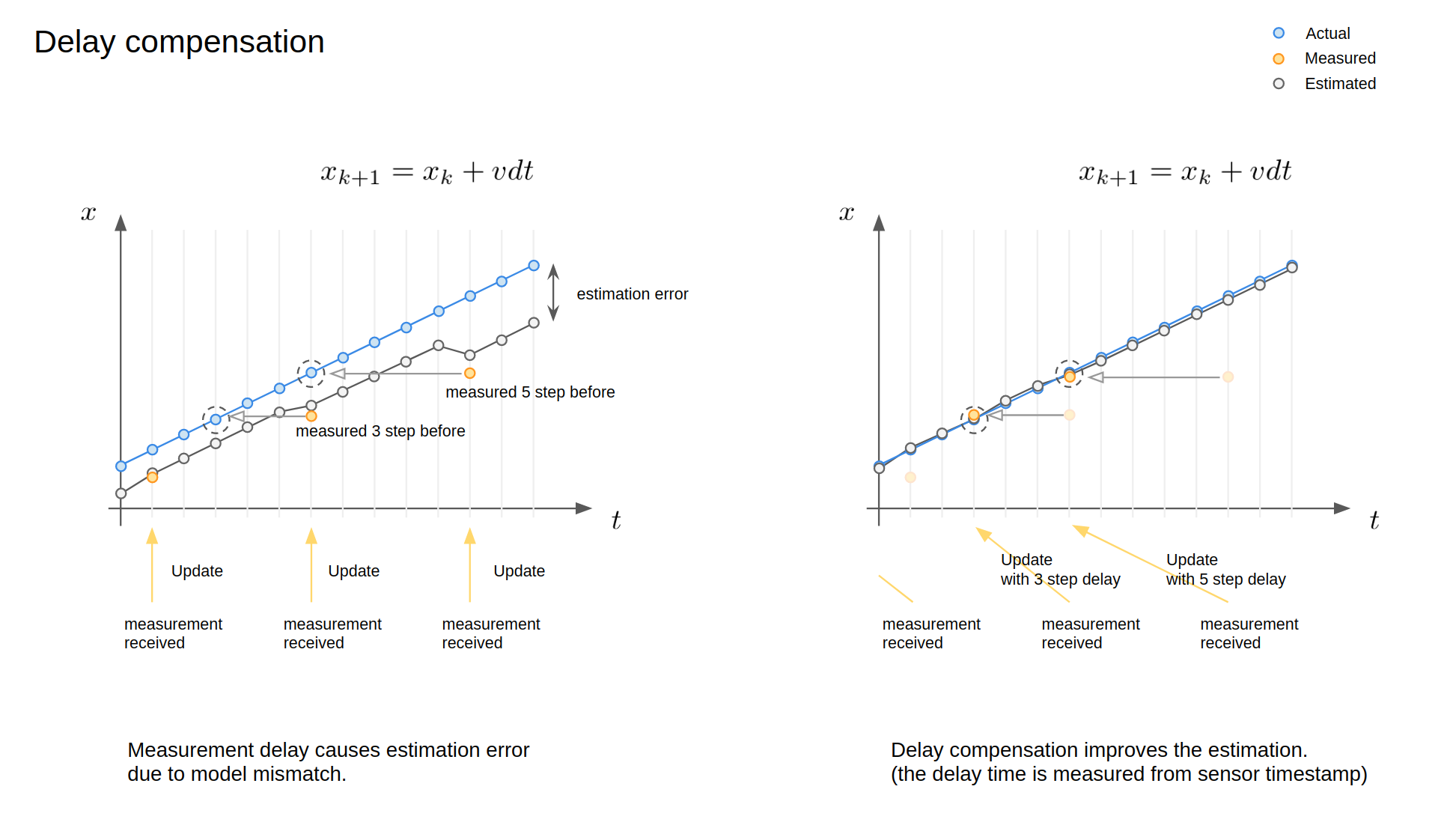 - Time delay compensation for input messages, which enables proper integration of input information with varying time delays. This is important especially for high-speed moving robots, such as autonomous driving vehicles. (see the following figure).