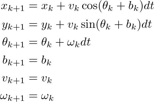 where, \(\theta_k\) represents the vehicle's heading angle, including the mounting angle bias. \(b_k\) is a correction term for the yaw bias, and it is modeled so that \((\theta_k+b_k)\) becomes the heading angle of the base_link. The pose_estimator is expected to publish the base_link in the map coordinate system. However, the yaw angle may be offset due to calibration errors. This model compensates this error and improves estimation accuracy.
