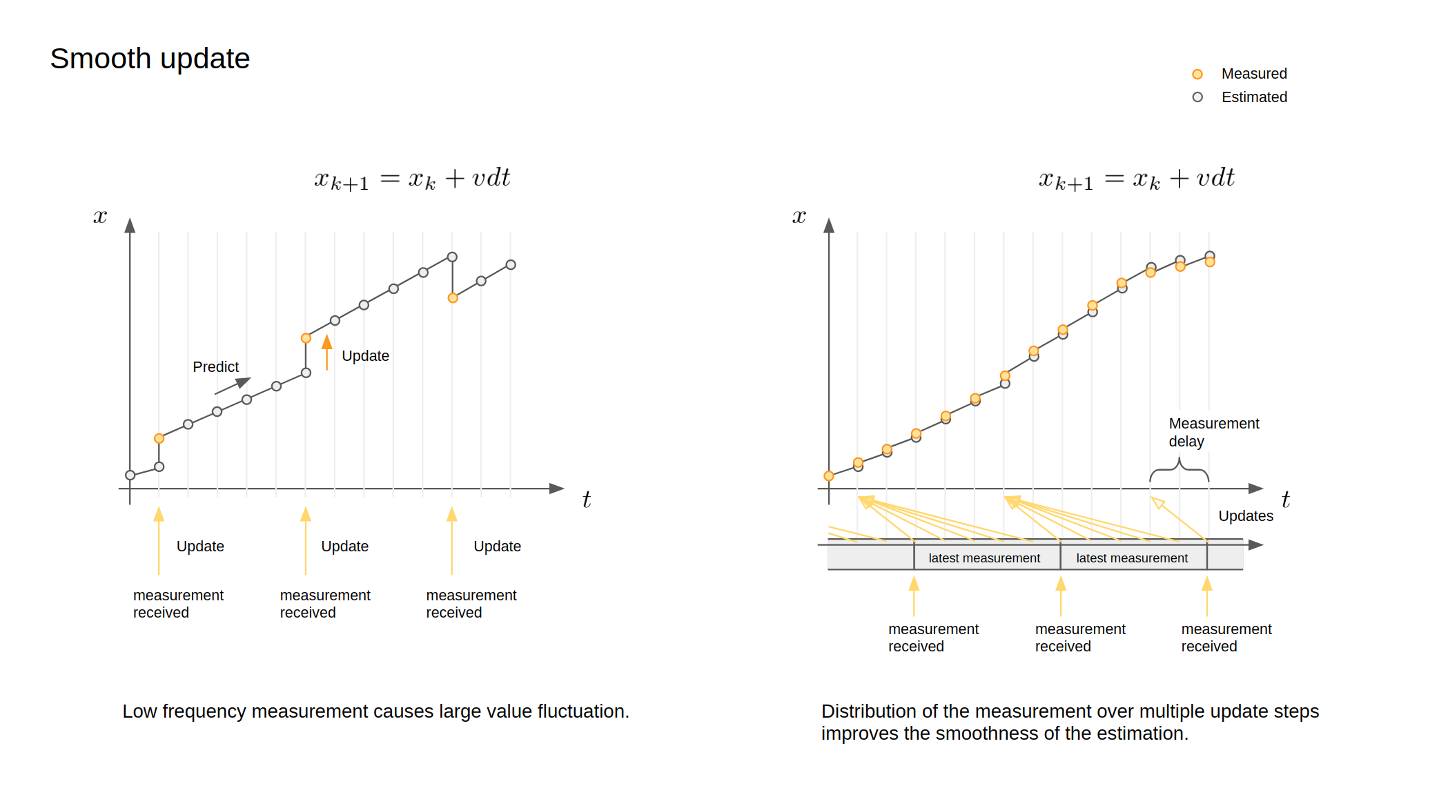 - Smooth update, the Kalman Filter measurement update is typically performed when a measurement is obtained, but it can cause large changes in the estimated value, especially for low-frequency measurements. Since the algorithm can consider the measurement time, the measurement data can be divided into multiple pieces and integrated smoothly while maintaining consistency (see the following figure).