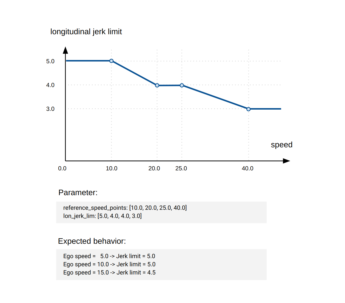 Notation 2: If you use vehicles in which the driving force is controlled by the accelerator/brake pedal, the jerk limit, denoting the pedal rate limit, must be sufficiently relaxed at low speeds. Otherwise, quick pedal changes at start/stop will not be possible, resulting in slow starts and creep down on hills. This functionality for starting/stopping was embedded in the source code but was removed because it was complex and could be achieved by parameters.
