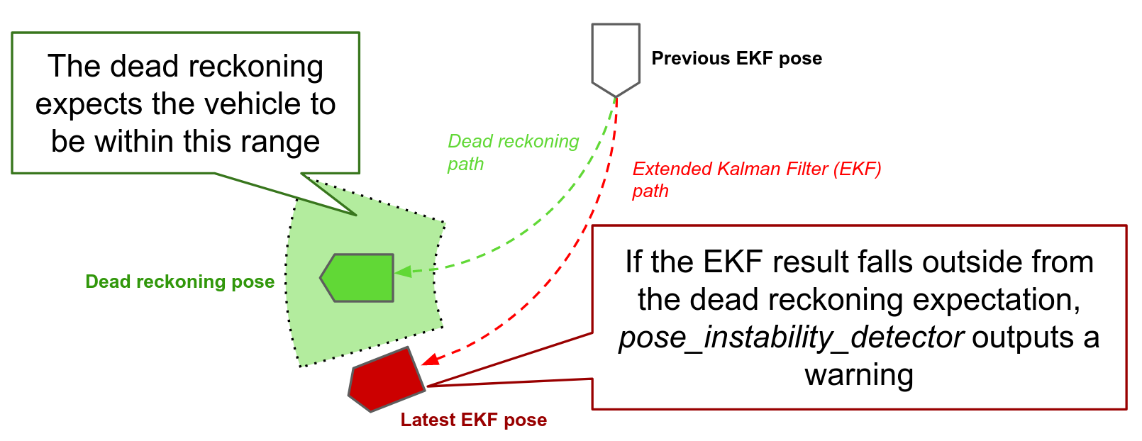 The pose_instability_detector node compares the pose calculated by dead reckoning with the latest pose from the EKF output.