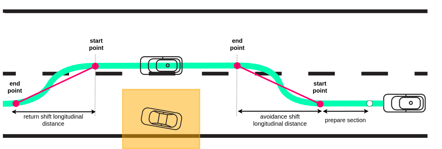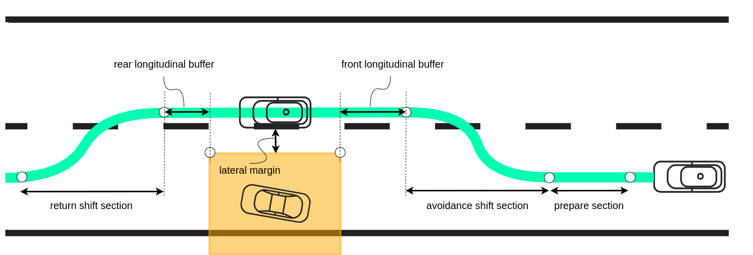 | longitudinal.min_prepare_time | float | Avoidance shift starts from point ahead of this time x ego speed at least. | 1.0 | N/A |