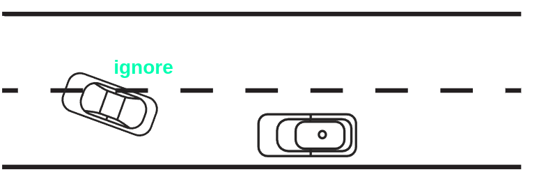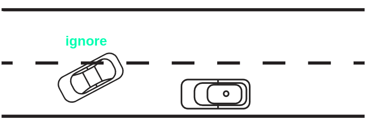 | Vehicle is merging into other lane from ego lane. Most of its footprint is on ego lane. | ![]() |