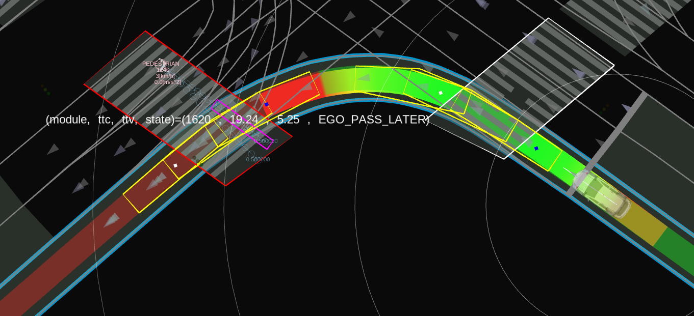 - The main reason is that the crosswalk module does not know the ego's position in the future. The detailed ego's position will be determined after the whole planning.