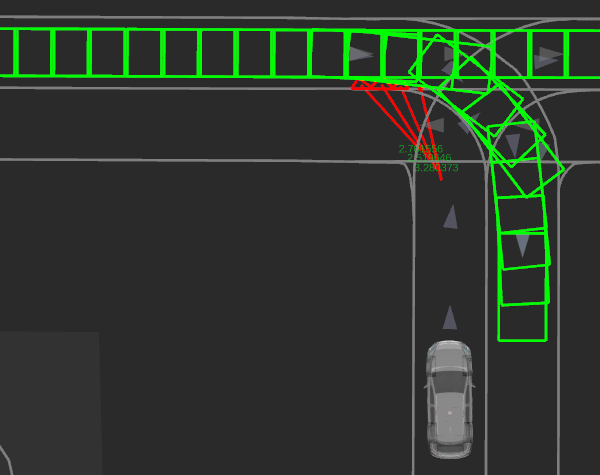 In the debug visualization, the ttc (in seconds) is displayed on top of its corresponding trajectory point. The color of the text is red if the collision should be avoided and green otherwise.