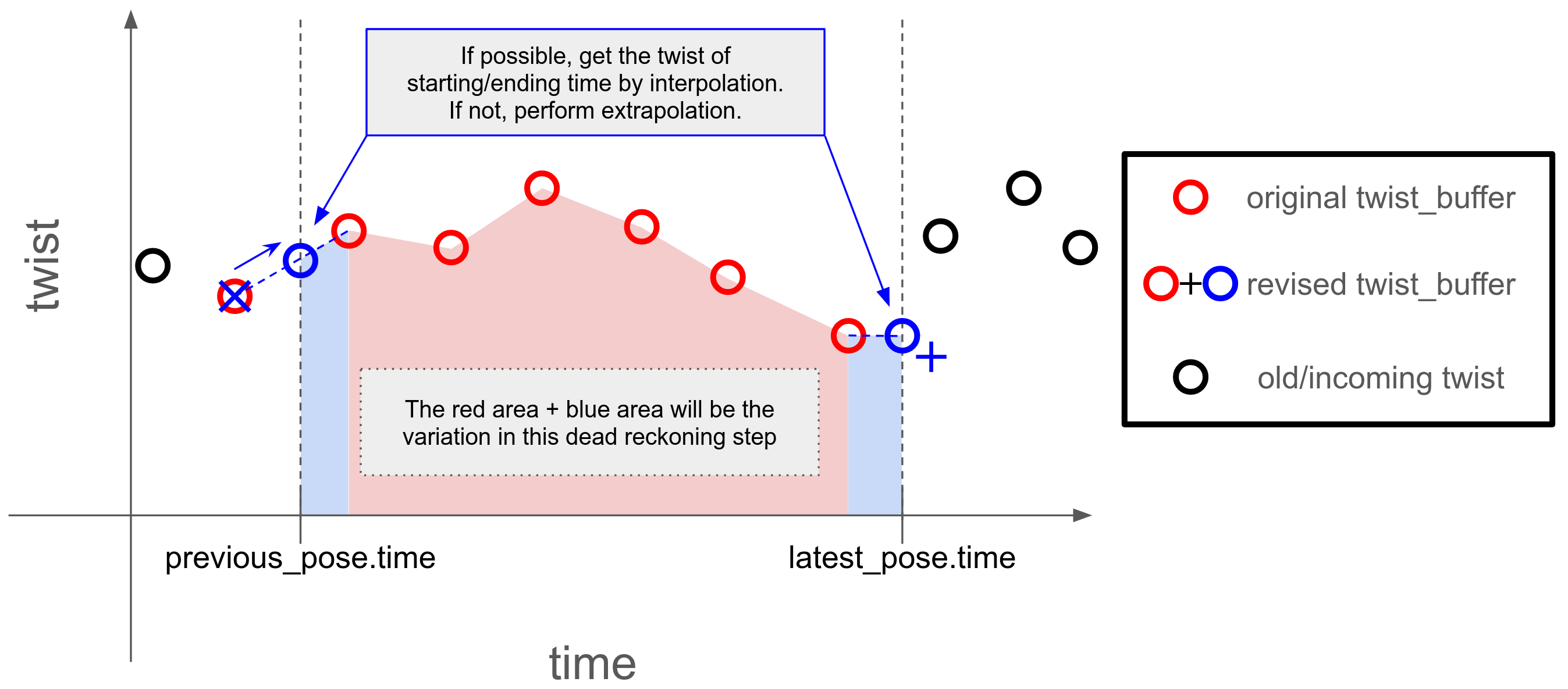 The pose_instability_detector node collects the twist values from the ~/input/twist topic to perform dead reckoning. Ideally, pose_instability_detector needs the twist values between the previous pose and the current pose. Therefore, pose_instability_detector snips the twist buffer and apply interpolations and extrapolations to obtain the twist values at the desired time.