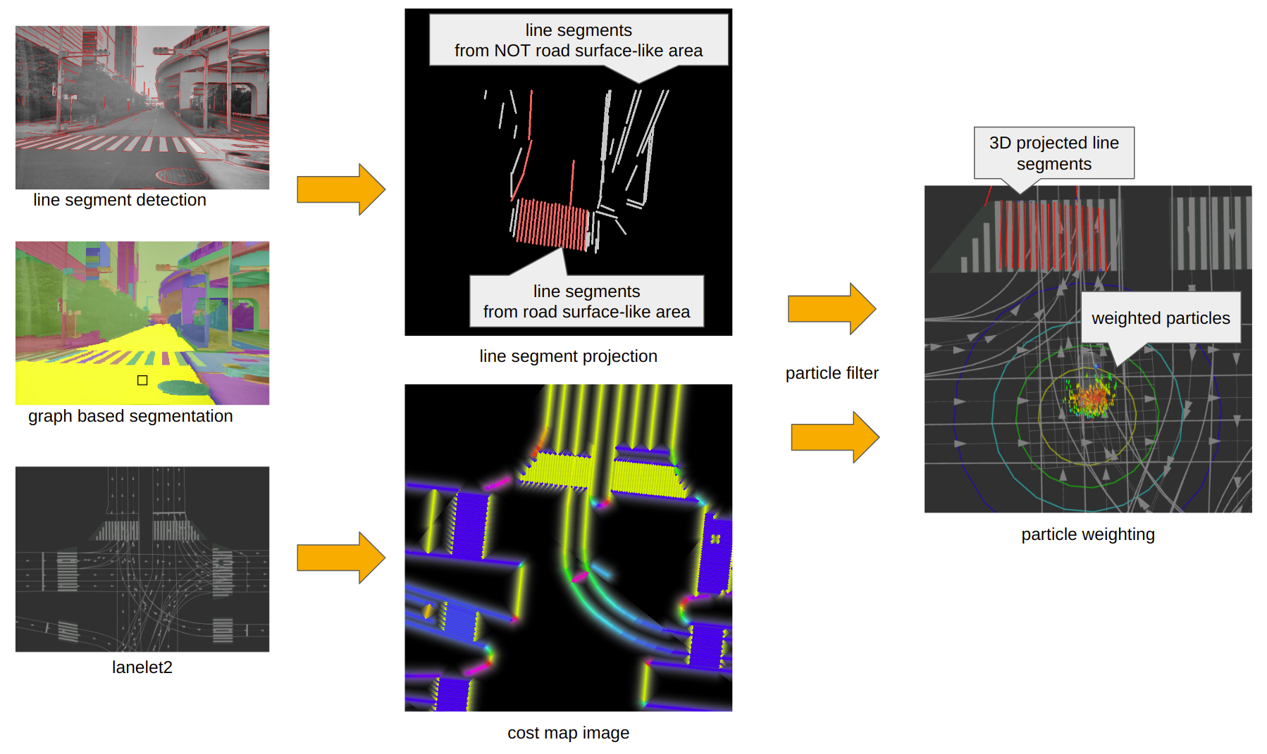 The diagram below illustrates the basic principle of YabLoc. It extracts road surface markings by extracting the line segments using the road area obtained from graph-based segmentation. The red line at the center-top of the diagram represents the line segments identified as road surface markings. YabLoc transforms these segments for each particle and determines the particle's weight by comparing them with the cost map generated from Lanelet2.