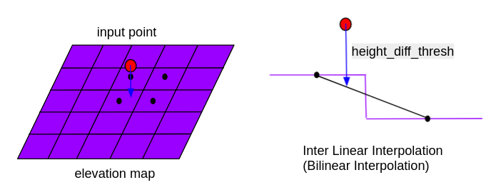 Compare the z of the input points with the value of elevation_map. The height difference is calculated by the binary integration of neighboring cells. Remove points whose height difference is below the height_diff_thresh.