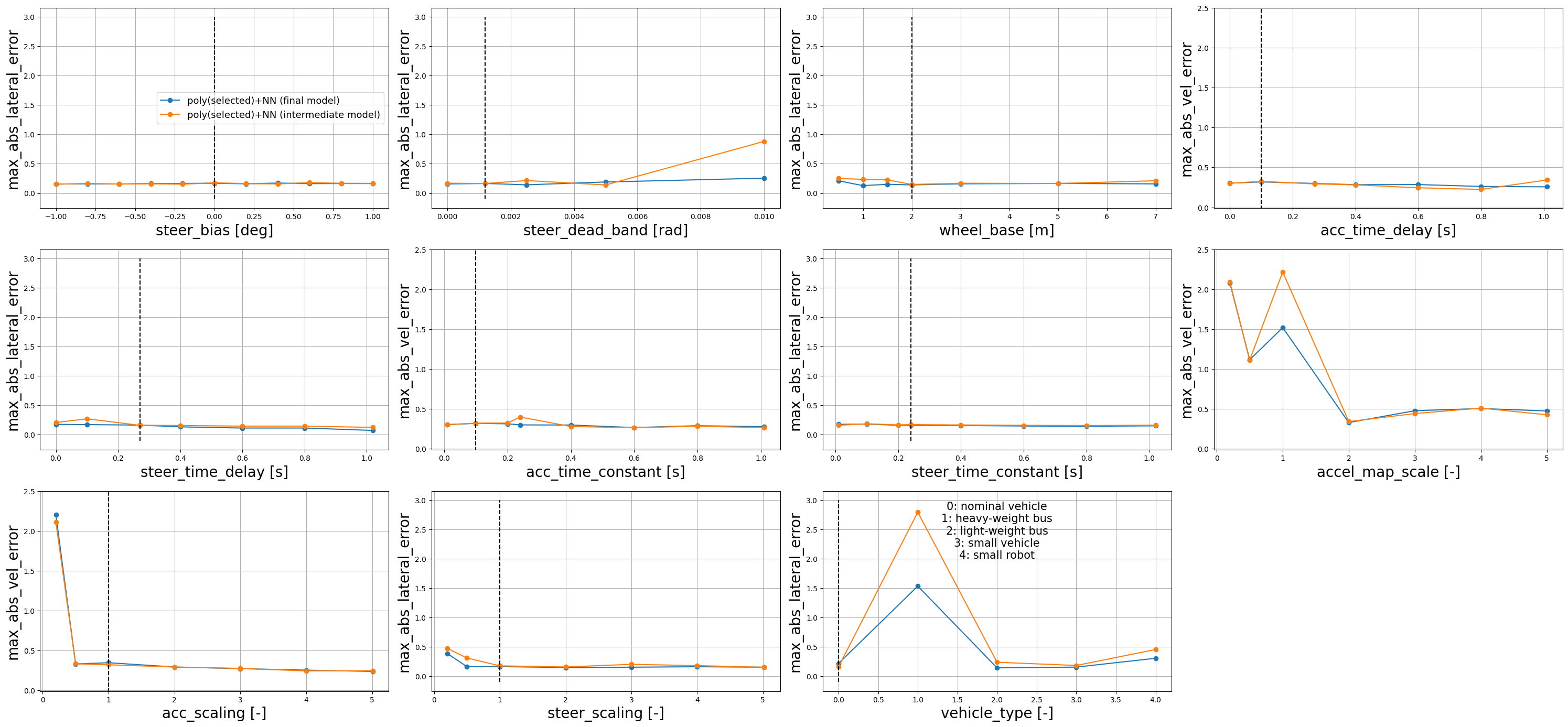 In most cases, sufficient performance is obtained, but for vehicle_type_1, which is intended for a heavy bus, a lateral deviation of about 2 m was observed, which is not satisfactory.