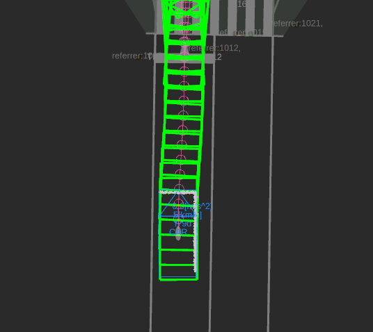 In the debug visualization, the ttc (in seconds) is displayed on top of its corresponding trajectory point. The color of the text is red if the collision should be avoided and green otherwise.
