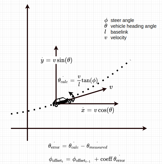 Calculate yaw rate error and then calculate steering error recursively by least squared method, for more details see updateSteeringOffset() function.